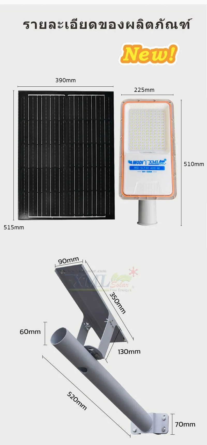น้ำหนักสินค้า : 4 กิโลกรัม จำนวนหลอดไฟ LED : 120 หลอด SMD LED IP65 (แสงสี : ขาว Day light)(2492.6 lumen) เวลาในการชาร์จเเสงอาทิตย์ : 6-8 ชั่วโมง (เเดดจ้า) เวลาทำงานกลางคืน : 10-12 ชั่วโมง ค่าอุณหภูมิ สีของแสงไฟ : 6,500 K แผงโซล่าเซลล์ : 6 V 40 Watt (Monocrystalline) 6 V 40 Watt (Polycrystalline) เเบตเตอรี่ลิเธี่ยม : 30,000 mAh (LiFePo4) 3.2V เสาสูงจากพื้น : แนะนำลูกค้าเลือกเสาสูงประมาณ 4 - 6 เมตร